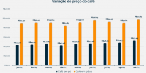 Em relação às variações de preço, o café permanece enfrentando elevações. Em setembro, a versão em pó apresentou aumento médio por quilo do produto de 9,3% em relação a agosto. Desde janeiro de 2024, o preço para o consumidor do tipo em pó subiu 22%, enquanto a versão em grãos cresceu 9%.