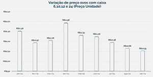 A categoria observou uma diminuição de 3,2% na indisponibilidade, retornando à estabilidade vista nos últimos meses. Quanto aos preços, o monitoramento revela uma queda contínua: em setembro, o produto alcançou seu menor valor desde abril, com a média de R$ 10,55, após ter atingido o pico de R$ 11,98 naquele mês.