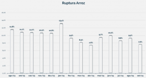 O arroz apresentou um índice de 7,8% de indisponibilidade nas prateleiras dos supermercados brasileiros – redução de 1,9% na comparação com o mês anterior. De acordo com o levantamento da Neogrid, esse é o segundo menor patamar dos últimos 14 meses – atrás apenas de abril de 2024 (7,6%).