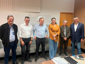 O presidente da Apras, Harri Pankratz, e o superintendente, Maurício Bendixen, realizaram uma visita ao Sistema Ocepar, onde foram recebidos por lideranças expressivas do cooperativismo paranaense: Robson Mafioletti, superintendente da Ocepar; Nelson Costa, superintendente da Fecoopar; Flavio Turra, gerente técnico e econômico da Ocepar; e Carolina Teodoro, coordenadora de Economia e Mercado.