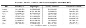 “O setor externo da economia paranaense mostra-se vigoroso. Em julho de 2024, o saldo da balança comercial foi de US$ 294 milhões, com uma corrente de comércio de US$ 3,8 bilhões”, observa o economista e assessor econômico da Fecomércio PR, Lucas Lautert Dezordi.