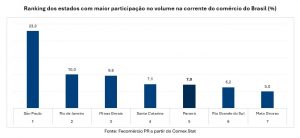 Considerando o volume total da corrente de comércio (exportações mais importações) no mês de julho, o Paraná foi responsável por 7% das transações comerciais do Brasil, ocupando a 5ª posição no ranking nacional. “Esse resultado foi impulsionado principalmente pela expressiva participação das exportações paranaenses, que totalizaram US$ 2,05 bilhões”, analisa Dezordi.