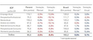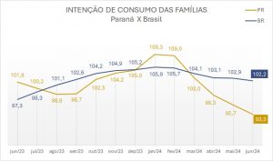 O índice de Intenção de Consumo das Famílias (ICF) continua caindo no Paraná. O indicador da Confederação Nacional do Comércio de Bens, Serviços e Turismo (CNC) e Federação do Comércio de Bens, Serviços e Turismo do Paraná (Fecomércio PR) teve nova redução em junho, ao sair dos 95,7 pontos em maio para 93,3 pontos em junho, o que corresponde a uma retração de 2,5%. O ICF paranaense vem apresentando sucessivas quedas desde fevereiro de 2024 e na variação anual sofreu contenção de 8,4%.